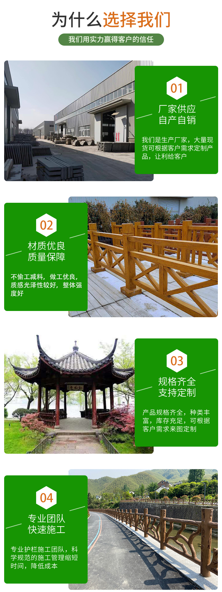 客户评价:我们咨询了多家公司,昊斯富的仿木护栏效果图与我们村的整体环境比较贴合,施工快速,整体效果也很好,既美化了环境,...